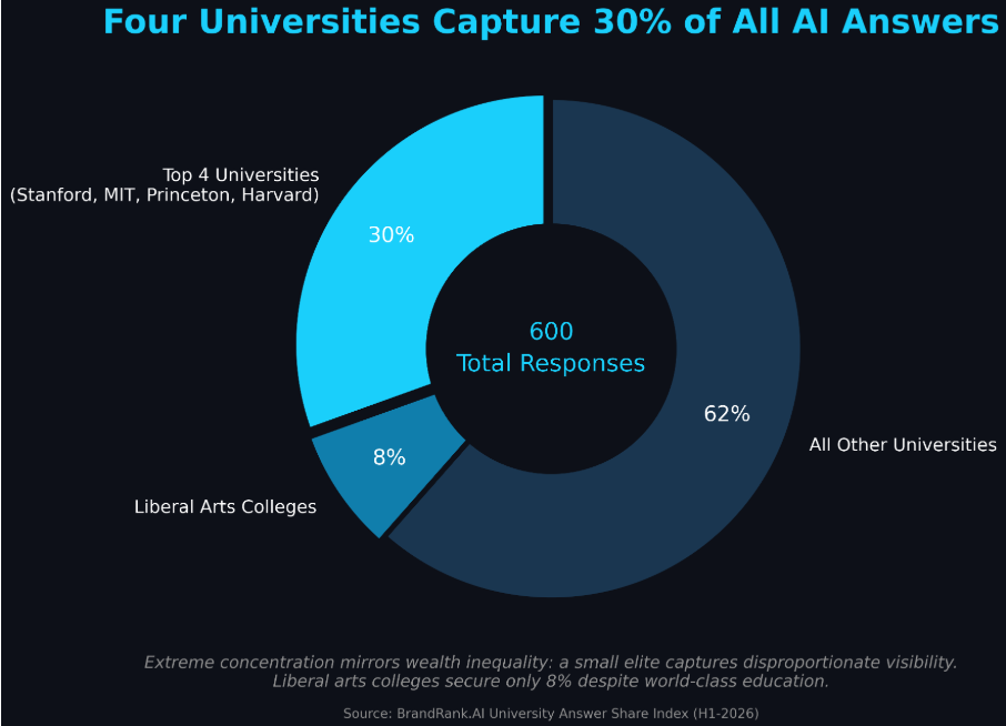 Stanford captures 70 AI mentions while liberal arts colleges appear in only 8% of responses—revealing extreme concentration in how AI reshapes college discovery