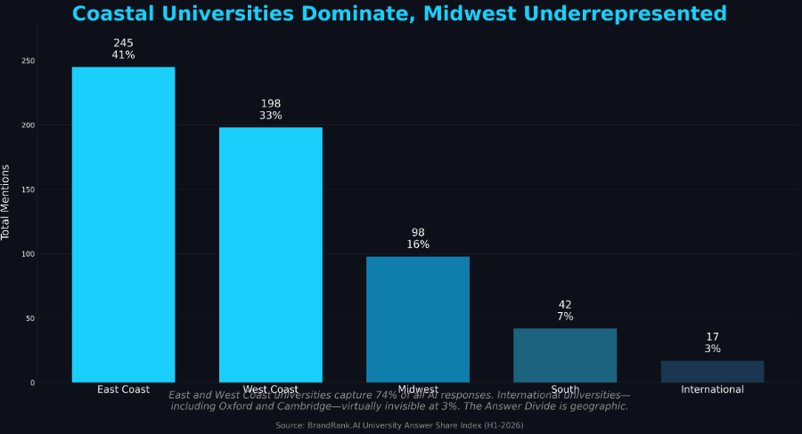 East and West Coast universities capture 74% of all AI responses. Midwest institutions collectively secure just 16%. The South manages 7%.