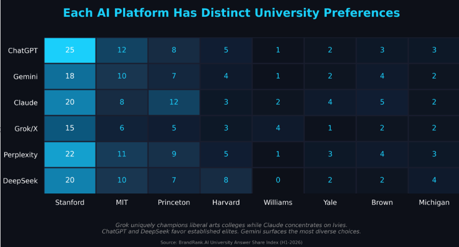 Grok stands alone. It uniquely champions liberal arts colleges—Williams, Swarthmore, and Amherst appear far more often than on other platforms. If you're a liberal arts institution, Grok is your friend. Everywhere else, you're struggling.